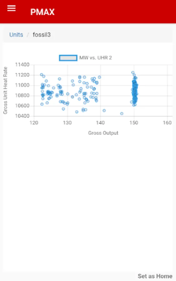 • A graph of the most recent 24 hours of unit gross heat rate versus gross generation can be displayed for any listed unit.