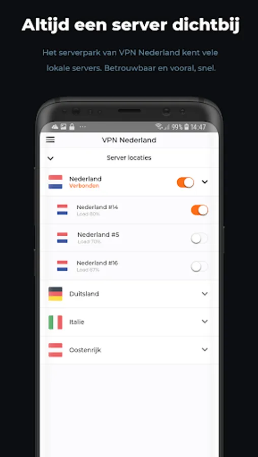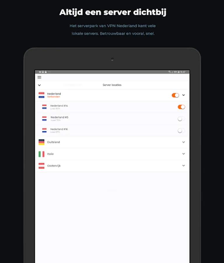 VPN Nederland not only offers Dutch-speaking customer service and tutorials, but also a rock-solid Dutch server park. This means you always have the fastest connections, and - thanks to our Smart DNS - including all the benefits of a foreign server. VPN Netherlands, always a secure and anonymous server close by.