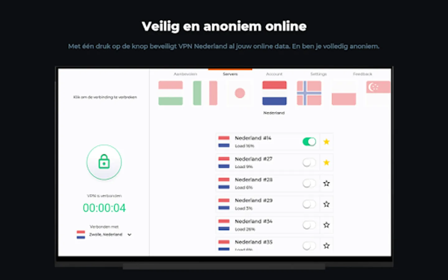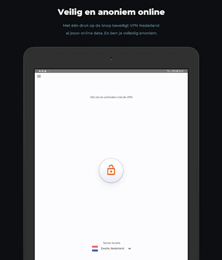 VPN Nederland encrypts and secures all your online data and makes you completely anonymous. You install the app and with one push of a button you are 100% secure online. In addition, you can view the American NetfIix, use public Wi-Fi securely and we are available to assist you 24/7. In Dutch.