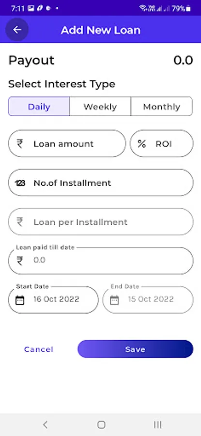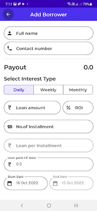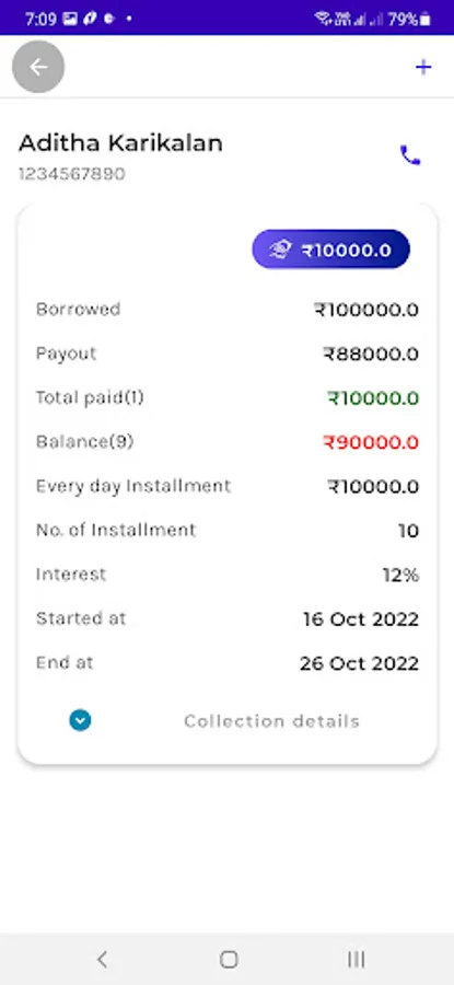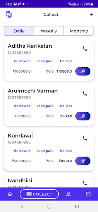 It is easy to enter the collected amount from the interest type-based borrower list for the day/week/month. On the borrower's profile, select the collect icon. Simply enter the collected amount in the amount column for that particular date. The list of borrowers offers options for editing collection entries.
