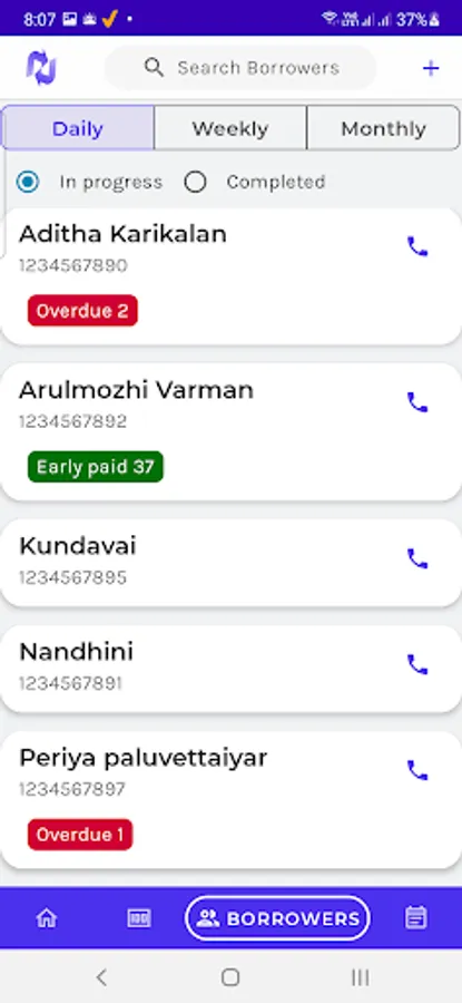 All your borrowers will be listed according to the interest type they are paying (Daily, Weekly, Monthly). Besides displaying the name and overdue status bar (if any), it also provides a call to action button. If borrowers fall behind on payments or have other concerns, it simplifies the process of reaching out to them. It is possible to further categorize the interest type-based list into 'In progress' and 'Completed'.