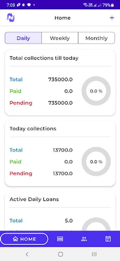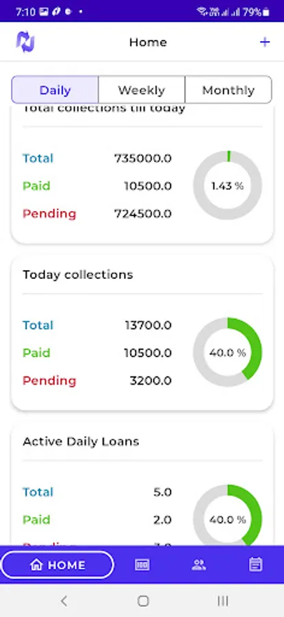 This dashboard shows total collections to date, today's collections and pending, active loans total, and paid and pending loans among the active loans. Here is a quick summary of how the business is doing as a whole.