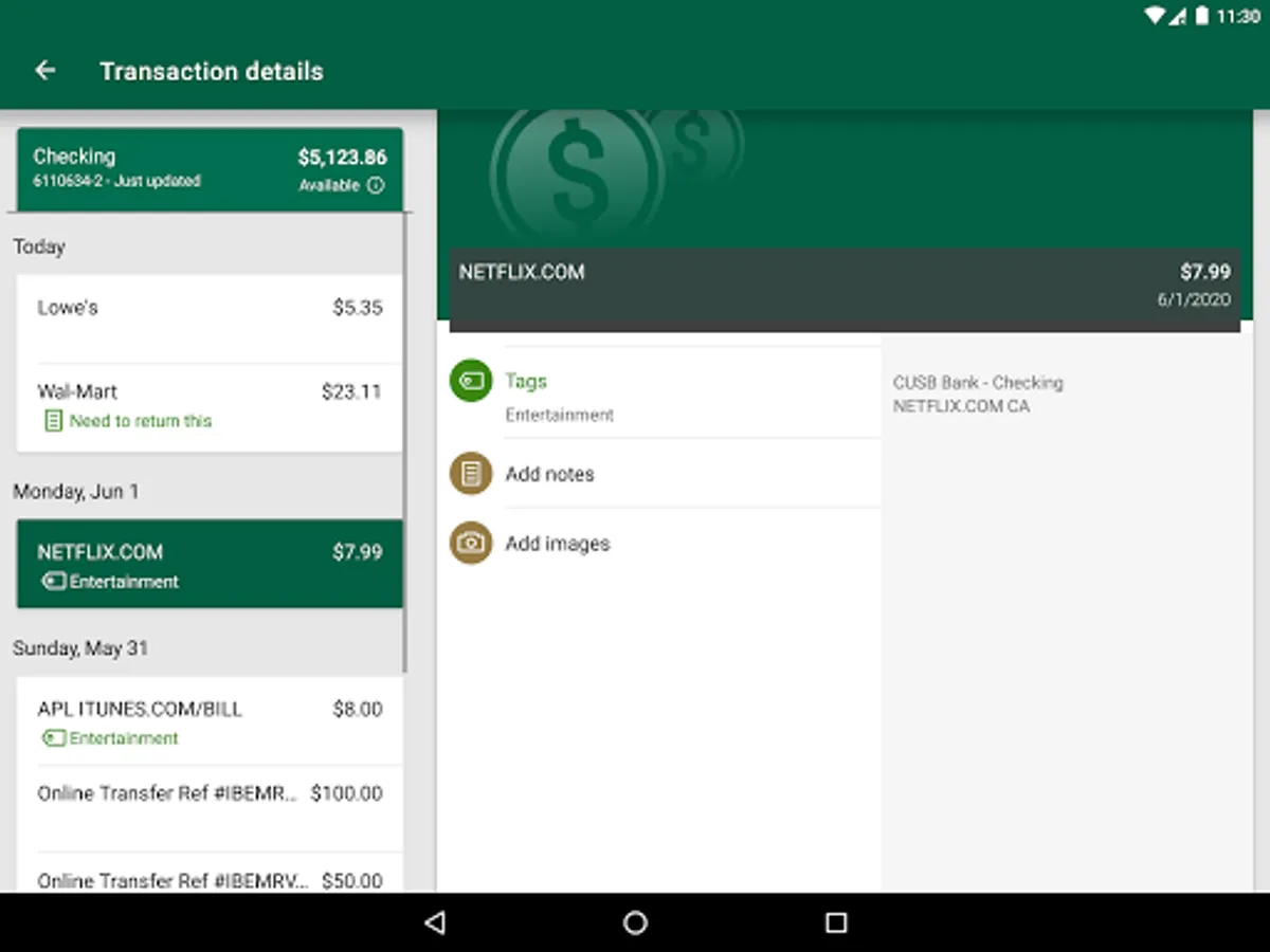 Keep your transactions organized by allowing you to add tags, notes and photos of receipts and checks.