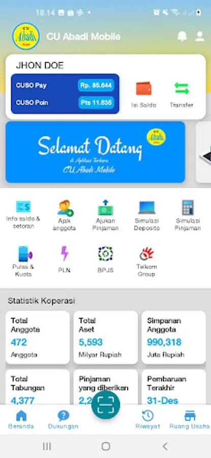 CU Abadi Mobile adalah aplikasi mobile dengan konsep ‘one stop solution’ dan salah satu platform koperasi yang mengandalkan teknologi digital. Sebagai salah satu aplikasi layanan dari PT. CUSO Digital Indonesia, CU Abadi Mobile ditujukan bagi anggota CU CU Abadi agar dapat melakukan segala aktivitas Transaksi keuangan Koperasi, Informasi, Promosi, PPOB dan Ruang Usaha (Marketplace) pada fitur-fitur yang telah disediakan aplikasi dengan menggunakan smartphone android.