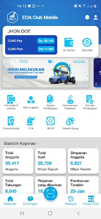 EOA Club Mobile is a mobile application with the concept of 'one stop solution' and a cooperative platform that relies on digital technology. As one of the service applications from PT. CUSO Digital Indonesia, EOA Club Mobile is intended for members of the Simpul Berkah Sinergi Savings and Loans Cooperative and Syariah Financing (KSPPSSBS) so that they can carry out all Cooperative financial transaction activities, Information, Promotion, PPOB and Business Space (Marketplace) on the features provided by the application by using an android smartphone.
