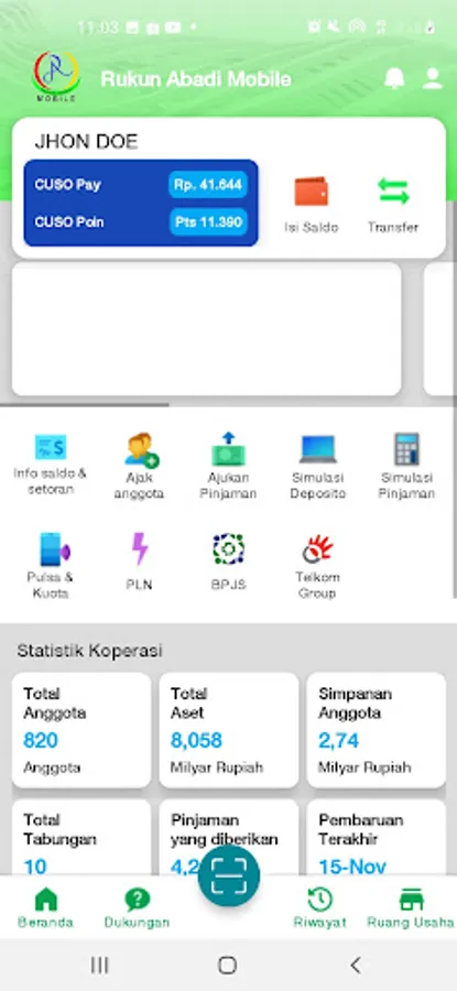 Rukun Abadi Mobile is a mobile application with a 'one stop solution' concept and a cooperative platform that relies on digital technology. As one of the service applications from PT. CUSO Digital Indonesia, Rukun Abadi Mobile is intended for Rukun Abadi KSP members to be able to carry out all Cooperative financial transaction activities, Information, Promotion, PPOB and Business Space (Marketplace) on the features provided by the application using an Android smartphone.