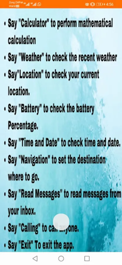 This application allows the blind user to perform some basic daily activities such as reading, calculator, weather, location, time, and date to know the battery status of the phone with the help of touch and tap on the mobile screen. Also, the main thing I have implemented is the user will open