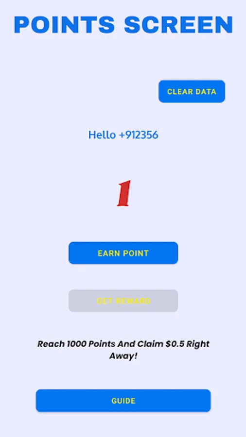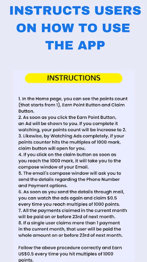 diruaA functions by serving Google ads to the users to earn money. The points counter in the home screen of the app starts from 1. A user is required to watch ads by clicking the earn point button on the home screen. When this process is complete, the points will increase to 2. Likewise, if a user hits multiples of 1000 points then that user can claim US$0.5 through a flexible mode of payments (UPI/ Phone Pe/ Google Pay/ Bank Account/ PayPal[For International Users Only]). There are no limitations for earning through this app, any user can earn as many times by reaching 1000 points successfully. A reset button is provided after successfully accomplishing the target in this app.