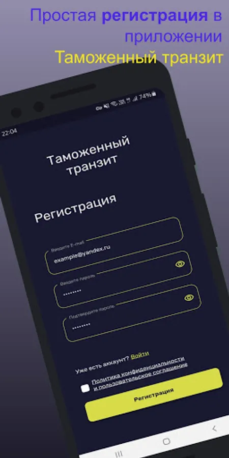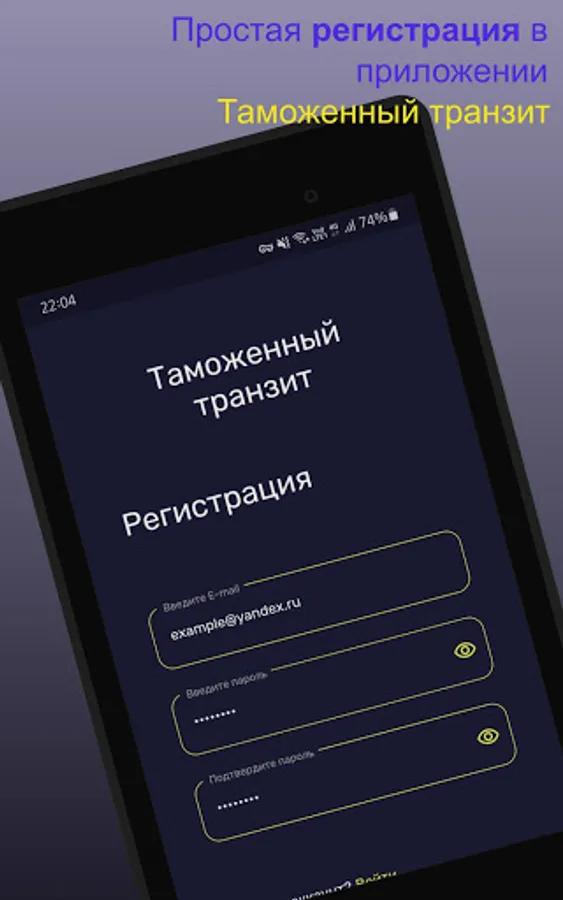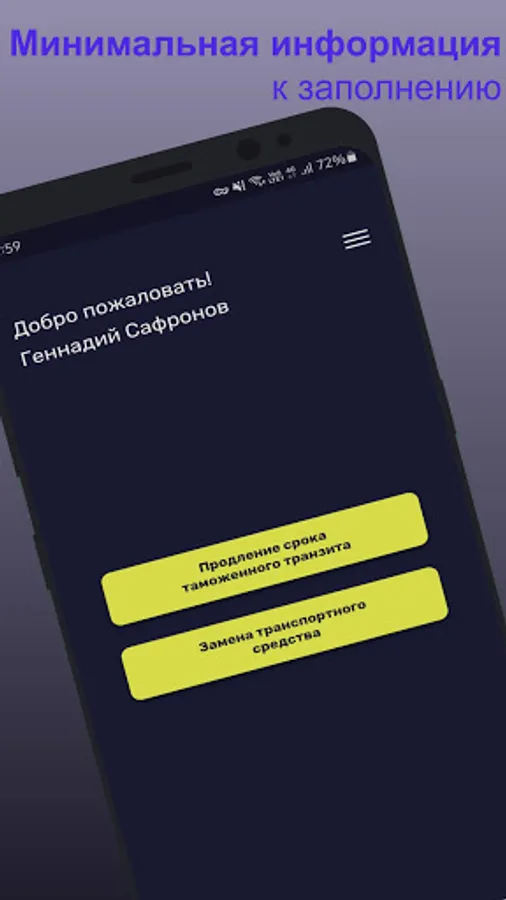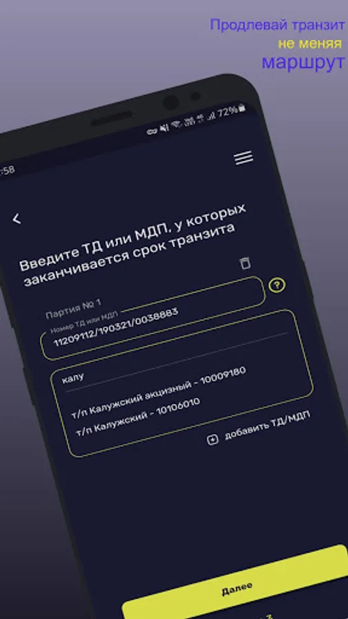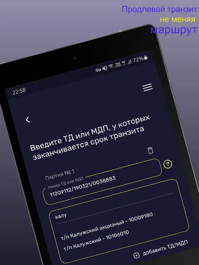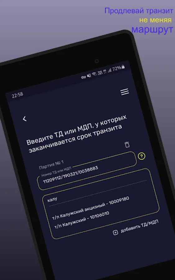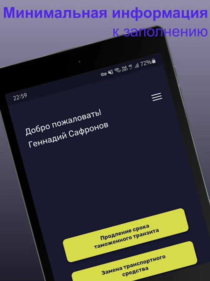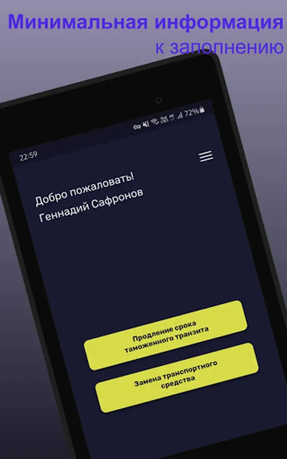 With the help of the application, you can easily apply (remotely) to almost any customs authority in the territory of the Russian Federation and the Republic of Belarus to extend the customs transit period or to replace the driving vehicle (without unloading the goods and without damaging the seals).