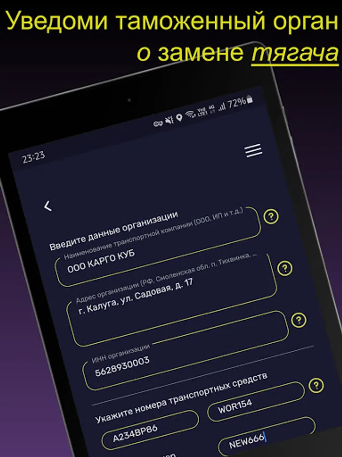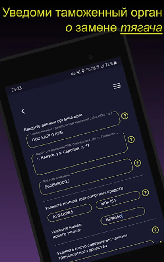 The main feature of the application is the creation of legally significant actions and your electronic appeals, which can later be used as an evidence base for your actions when extending transit or replacing a tractor.