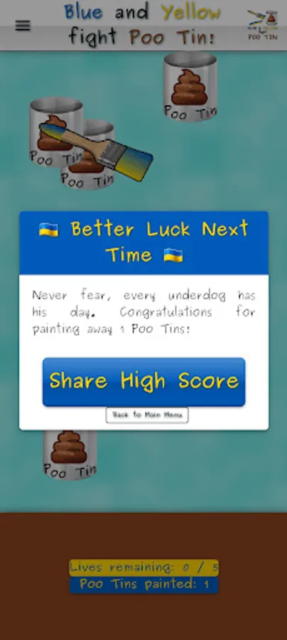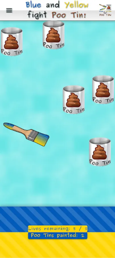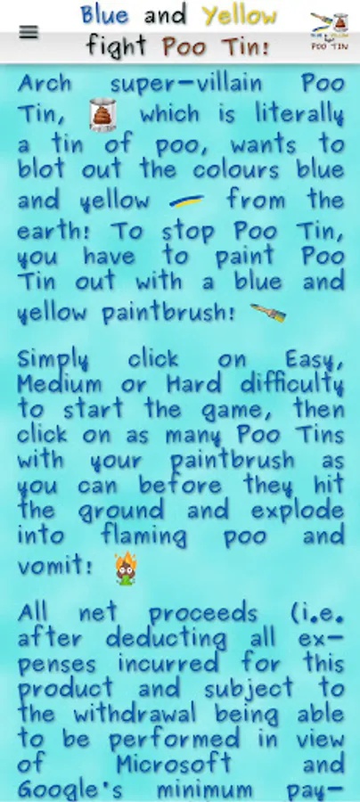 Arch super-villain Poo Tin, which is literally a tin of poo, wants to blot out the colours blue and yellow from the earth! To stop Poo Tin, you have to paint Poo Tin out with a blue and yellow paintbrush! All net proceeds (i.e. after deducting all expenses incurred for this product and subject to the withdrawal being able to be performed in view of Microsoft and Google's minimum payment threshold) shall be donated for humanitarian causes. This game is a work of fiction for entertainment purposes only. Any resemblance to actual persons, living or dead, or entities or events, is purely coincidental.