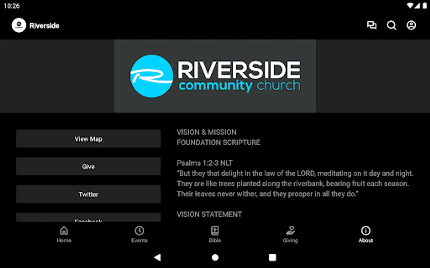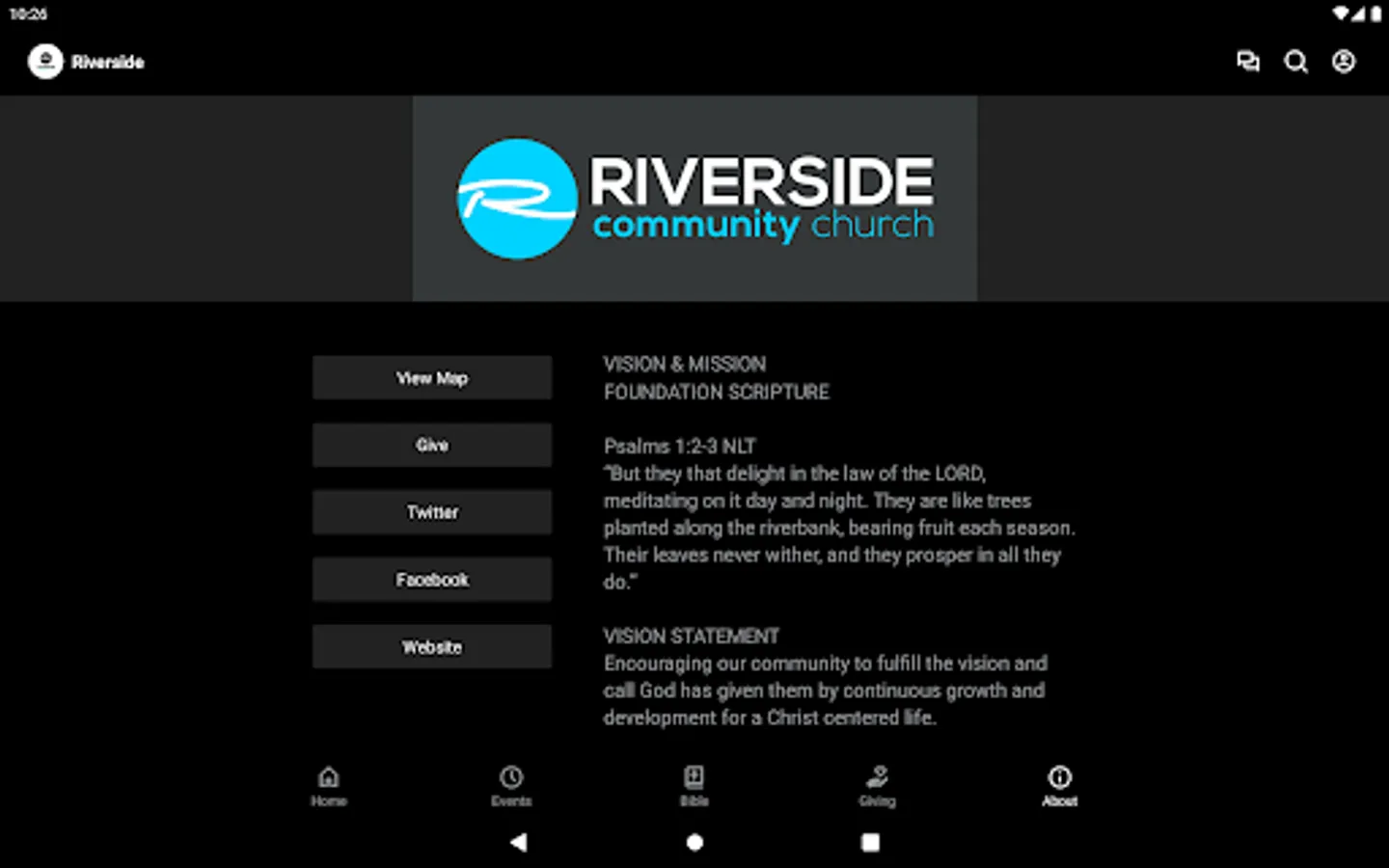 At Riverside Community Church, we believe every person has purpose, anyone can serve and we should all continue to grow and develop in our faith. Our desire is to help people live a Christ centered life, while they fulfill the vision and call God has given them. Our App is geared to help you achieve the full potential God has for you and your family. We hope the use of this app is thought provoking, spiritually challenging and a life changing experience as you continue your walk of faith.