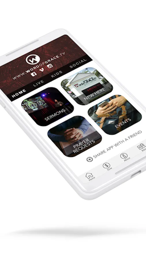 Word of Grace Church in Pineville, LA offers this custom app to provide you with finger-tip access to all of their resources. From watching live services to sermon archives to important events you can get it all here on this creative yet simply designed app layout that users of all ages can enjoy.