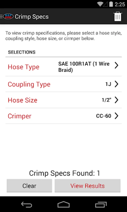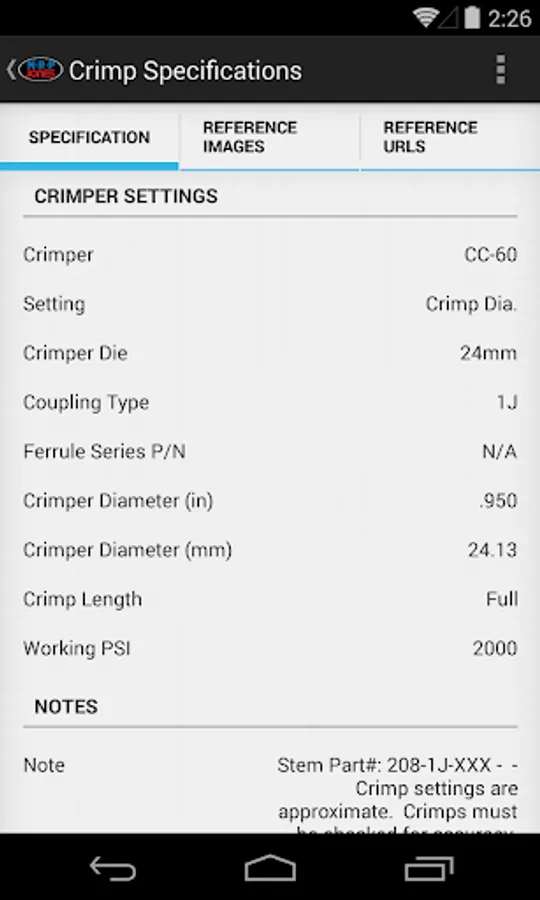 The MyCrimp application provides users with the up to date specifications to properly crimp NRP Jones hydraulic hose and fittings. Users can search by hose style, coupling style, hose size and crimper. The application contains all the information required to properly setup and crimp the desired hose and fitting. In addition to crimp specifications, the app also includes a cross reference to assist in finding the correct NRP Jones product number.