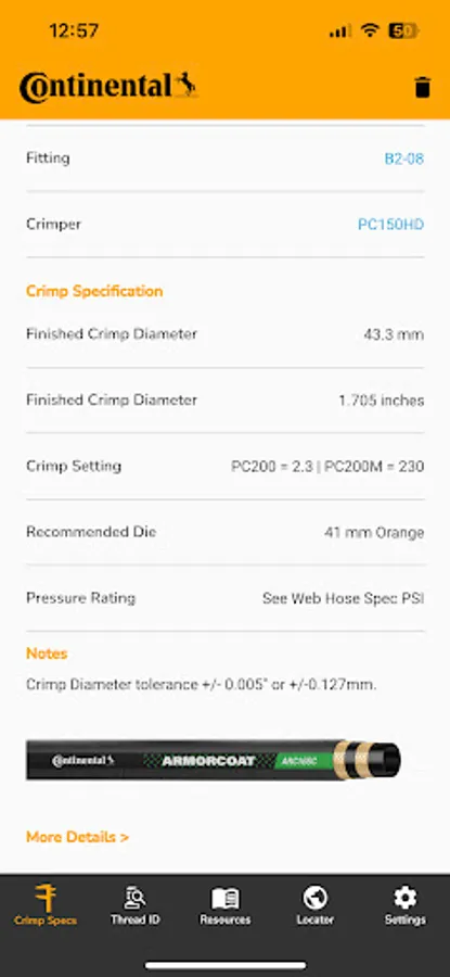 C-IQ Mobile provides hose fabricators with up-to-date specifications to properly crimp Continental industrial and hydraulic hoses. In addition to crimp specifications, our new Thread ID tool helps quickly and easily identify the thread types of your fittings.