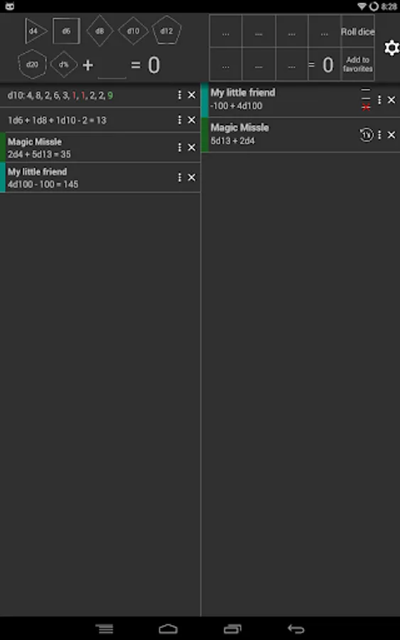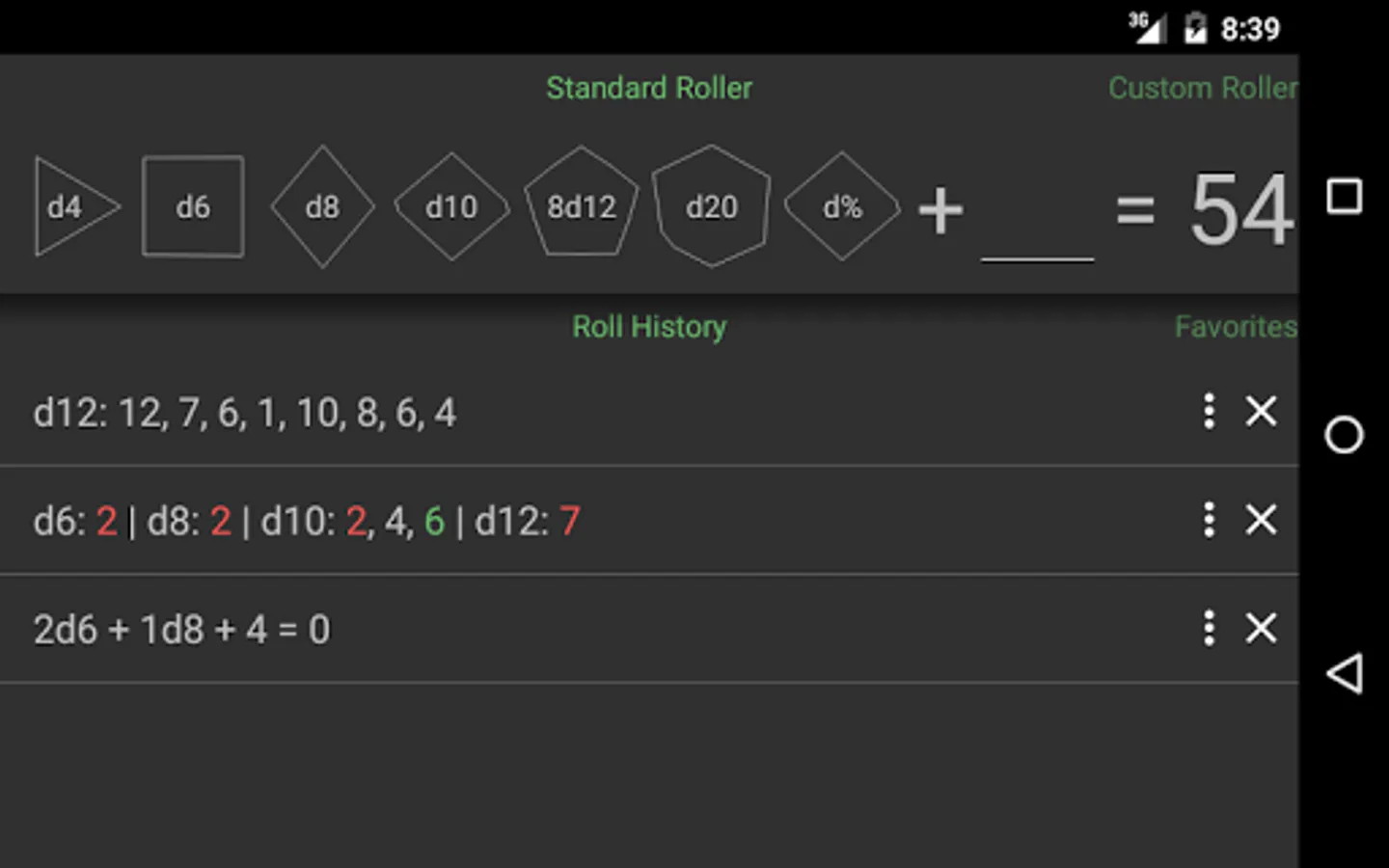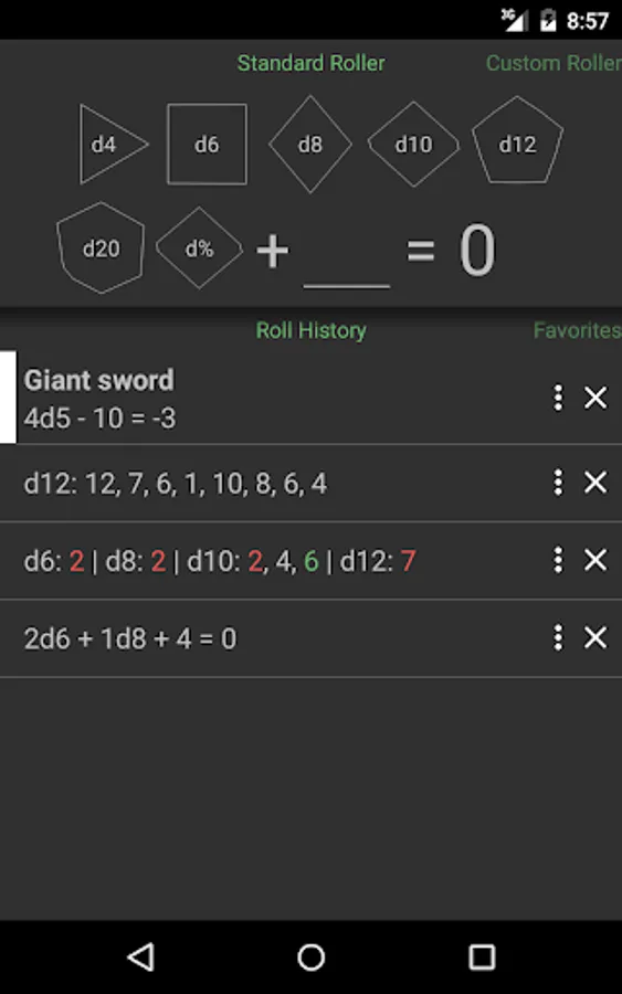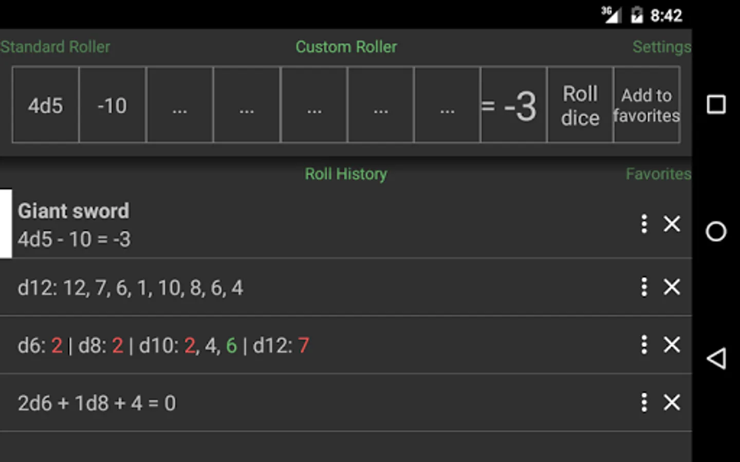 Roll history - view past rolls as a sum or individual dice rolls, re-roll one's, or create a favorite instantly from a past roll