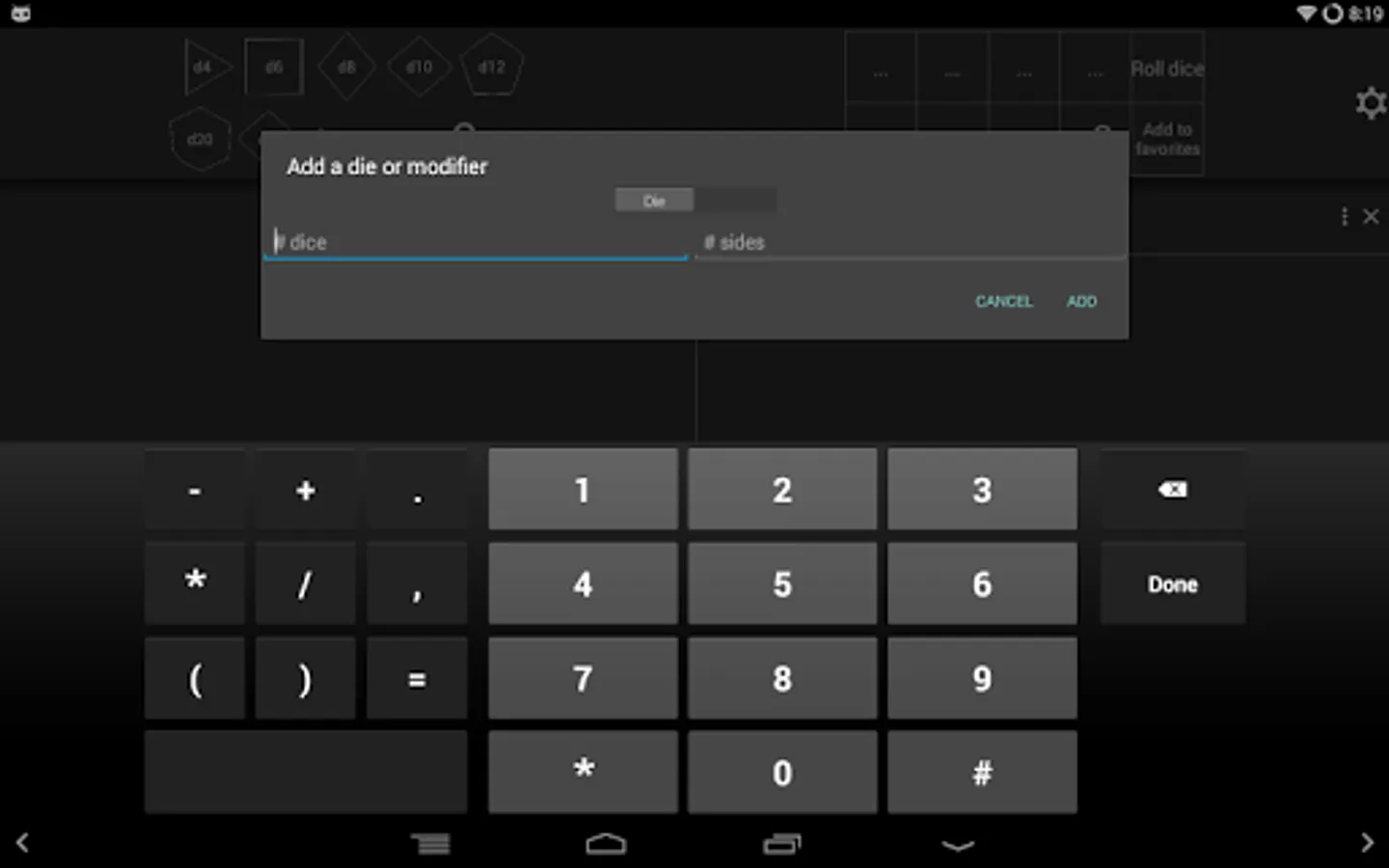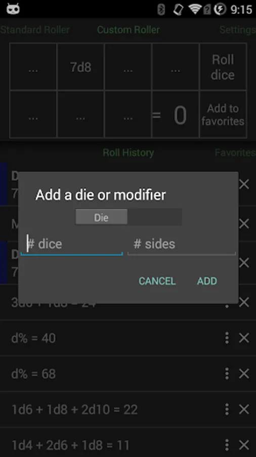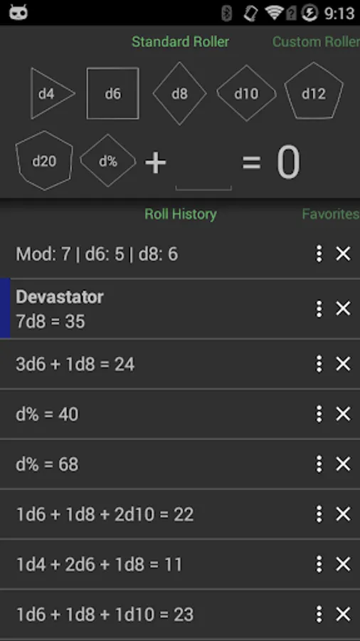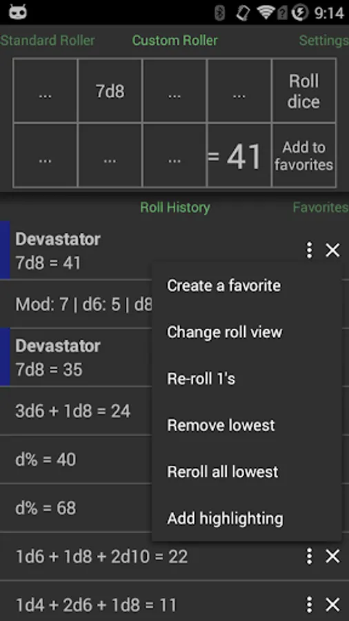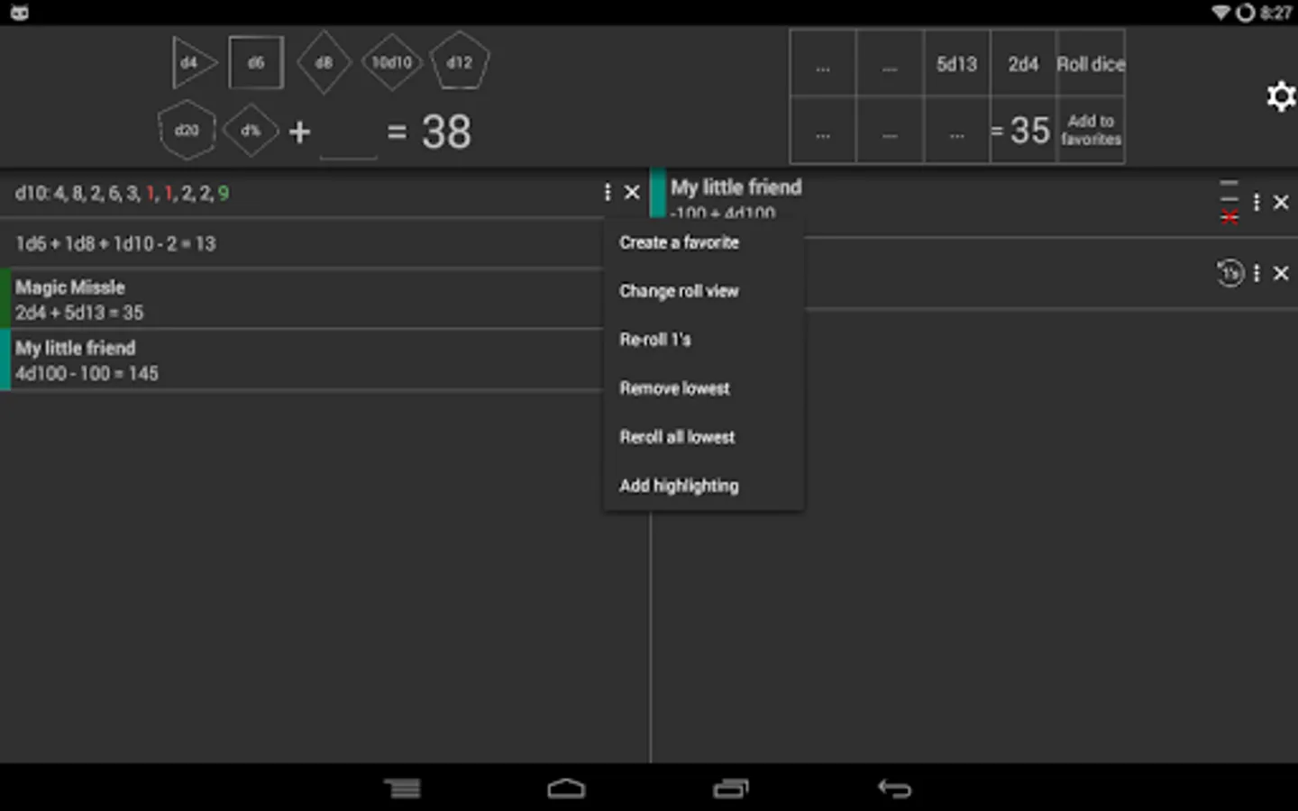 Roll history - view past rolls as a sum or individual dice rolls, re-roll one's, or create a favorite instantly from a past roll