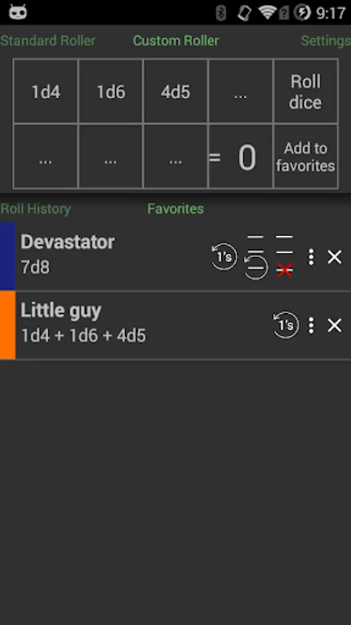 Favorites - save your commonly used dice sets, change the name, change the color, upload them back to the roller