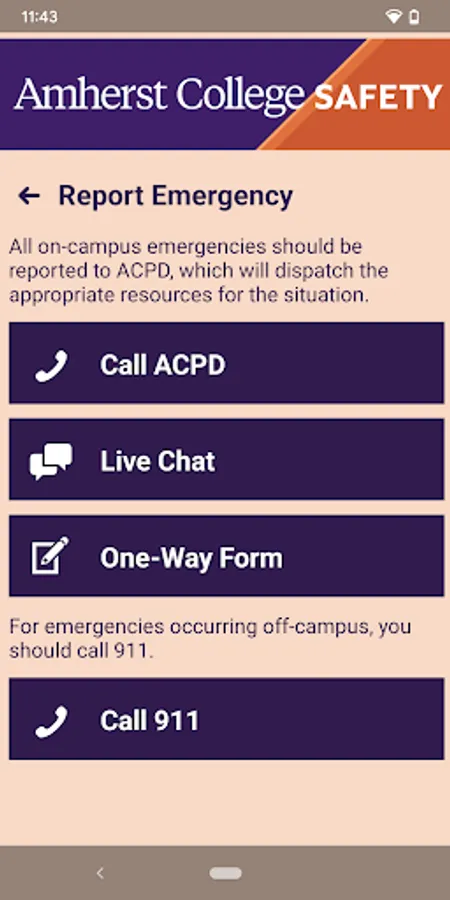 Amherst College Safety is the official safety app of Amherst College. It is the only app that integrates with Amherst College's safety and security systems. ACPD has worked to develop a unique app that provides students, faculty and staff with added safety on the Amherst College campus. The app will send you important safety alerts and provide instant access to campus safety resources.