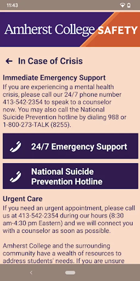 - Safety Notifications: Receive instant notifications and instructions from Amherst College safety when on-campus emergencies occur.