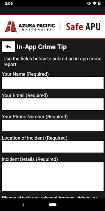 - Tip Reporting: Multiple ways to report a safety/security concern directly to Azusa Pacific University security.