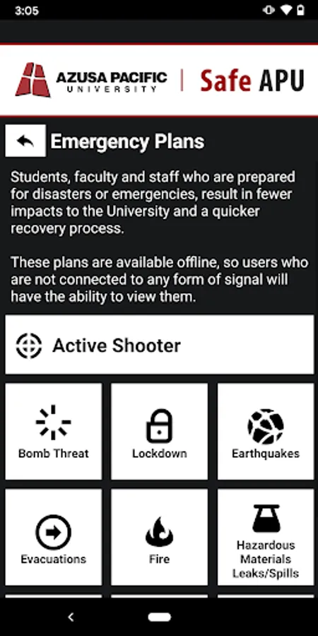- Emergency Plans: Campus emergency documentation that can prepare you for disasters or emergencies. This can be accessed even when users aren’t connected to Wi-Fi or cellular data.