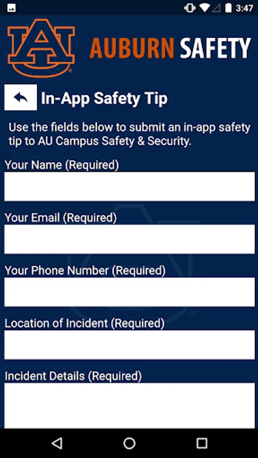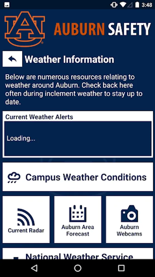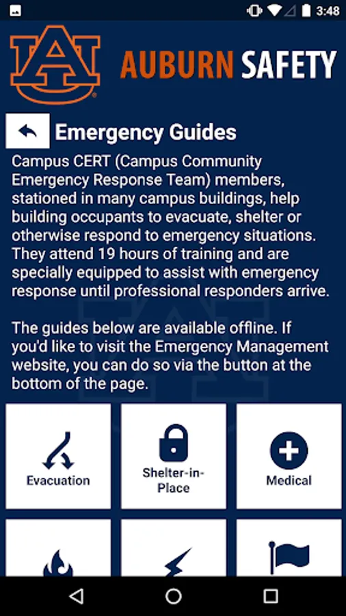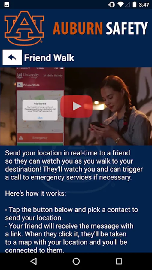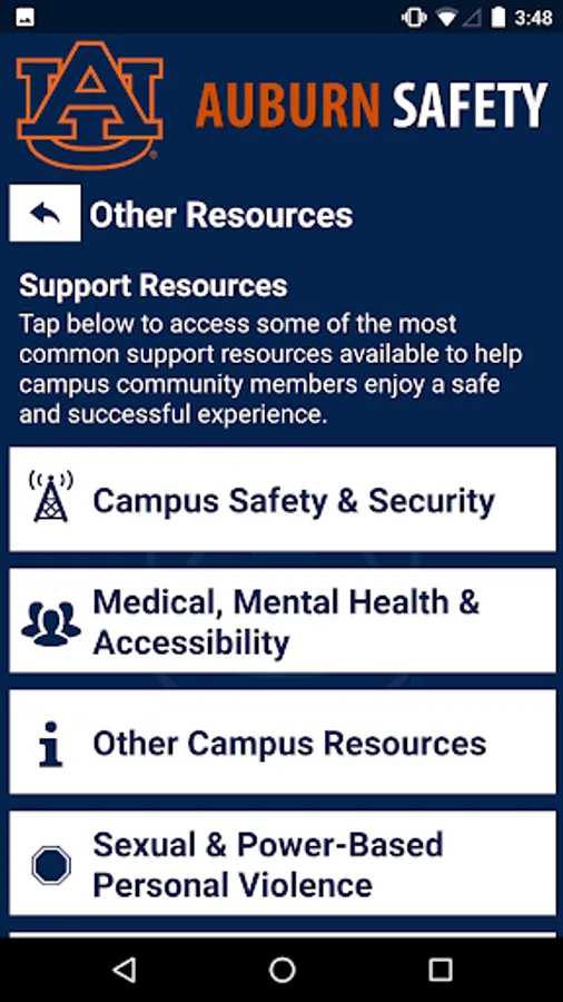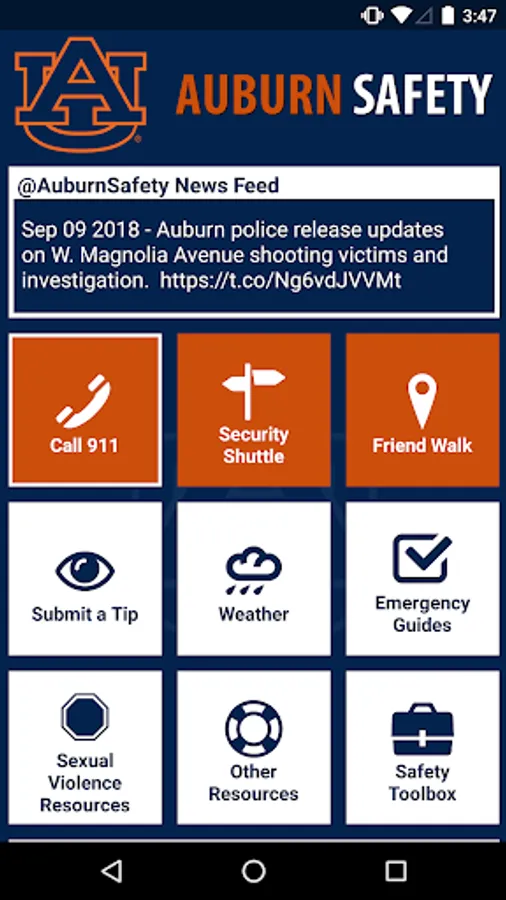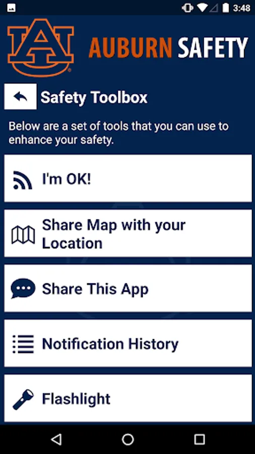 Auburn Safety is the official safety app of Auburn University. It is the only app that integrates with Auburn University's safety and security systems. Campus Safety has worked to develop a unique app that provides students, faculty and staff with added safety on the Auburn University campus. The app will send you important safety alerts and provide instant access to campus safety resources.