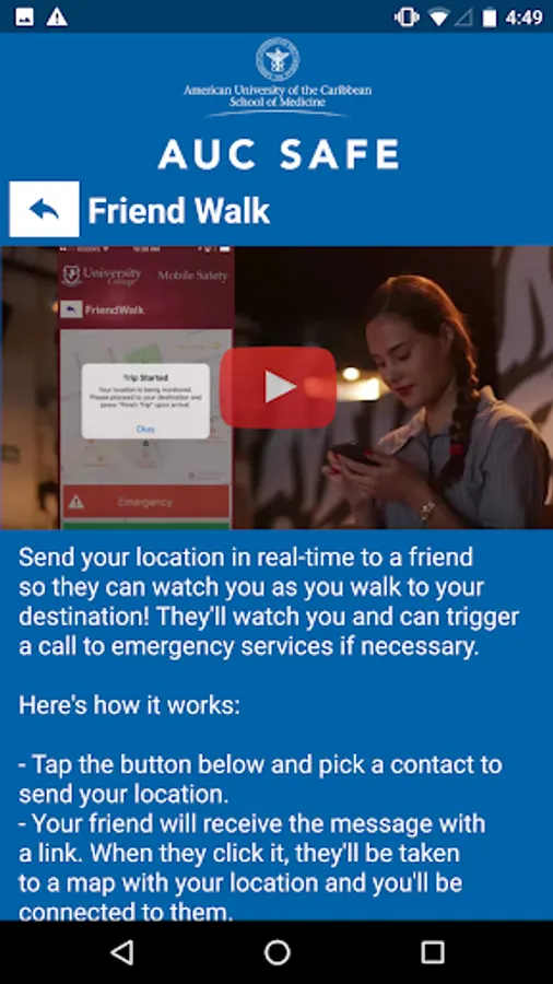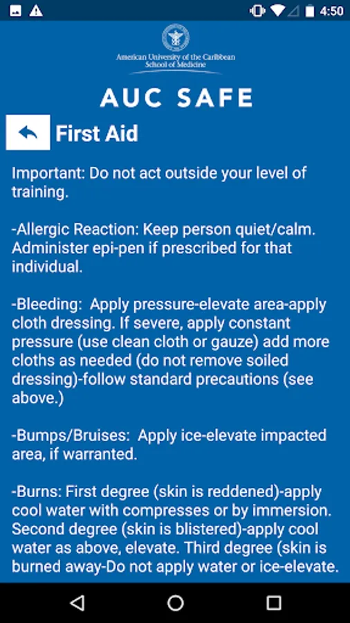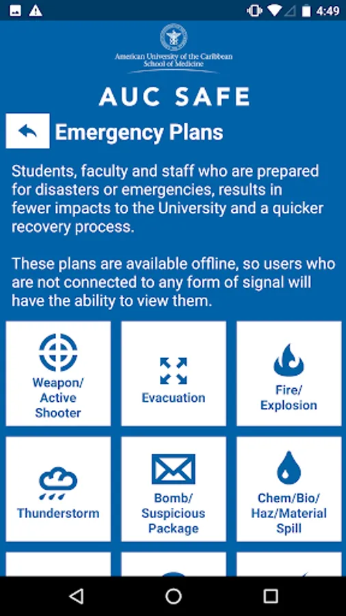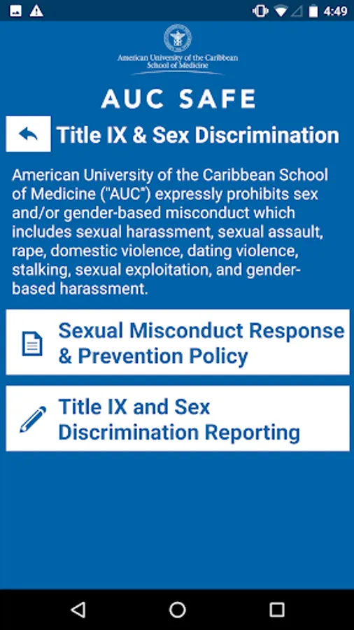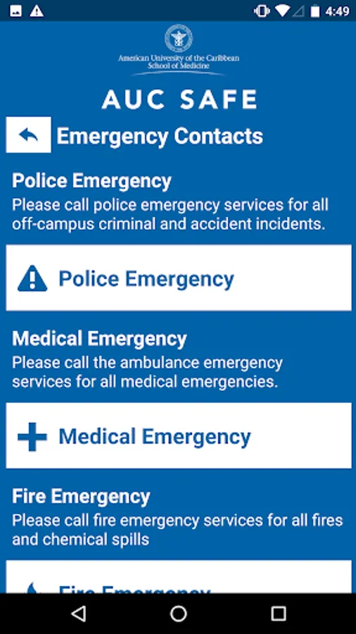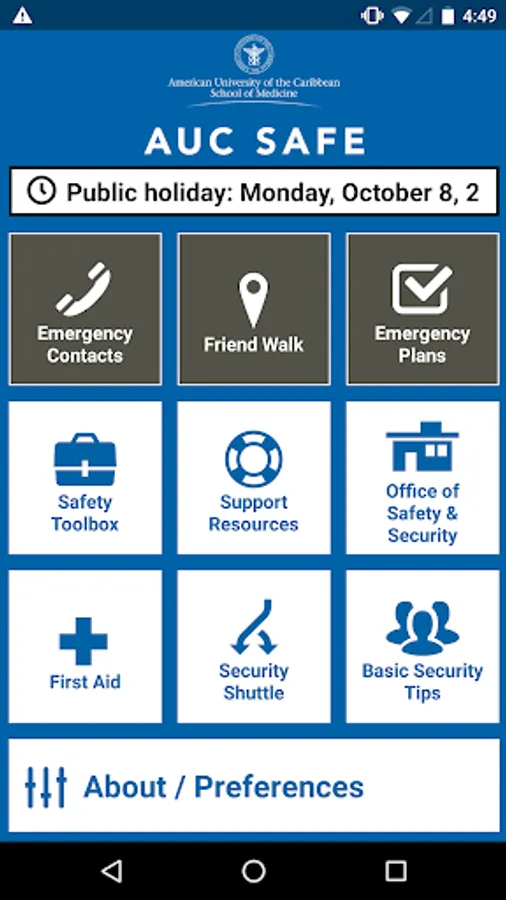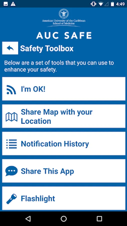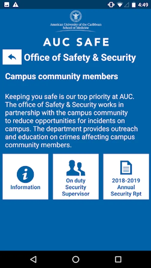 AUC Safe is the official safety app of the American University of the Caribbean School of Medicine. It is the only app that integrates with AUCMED's safety and security systems. Safety and Security has worked to develop a unique app that provides students, faculty and staff with added safety on the AUCMED campus. The app will send you important safety alerts and provide instant access to campus safety resources.