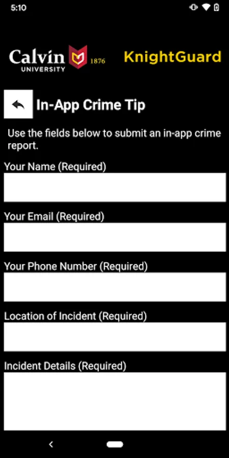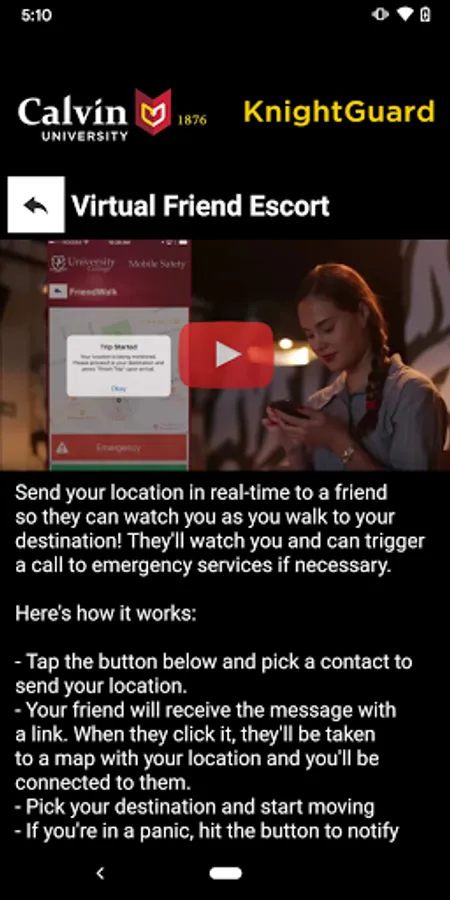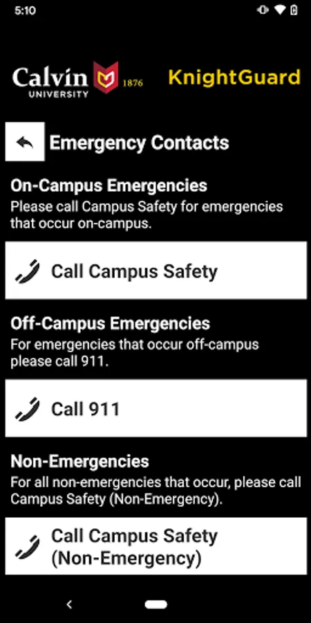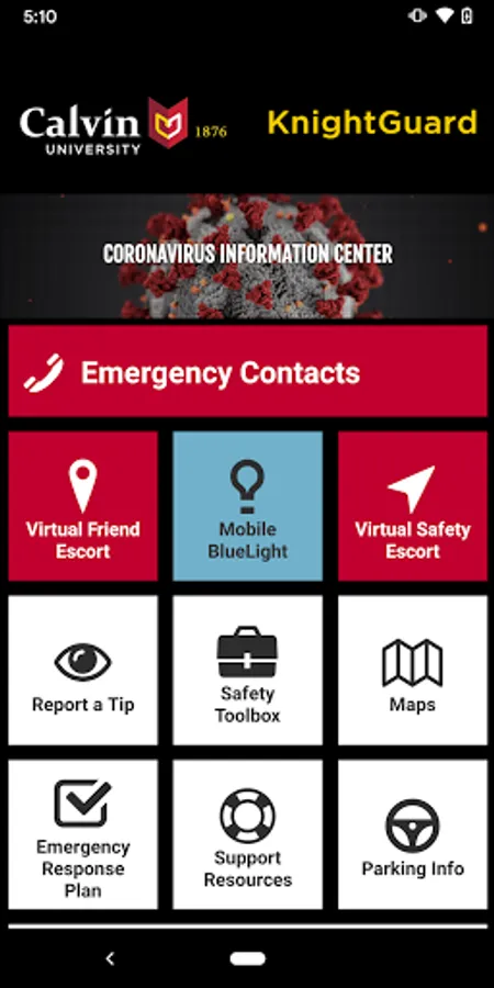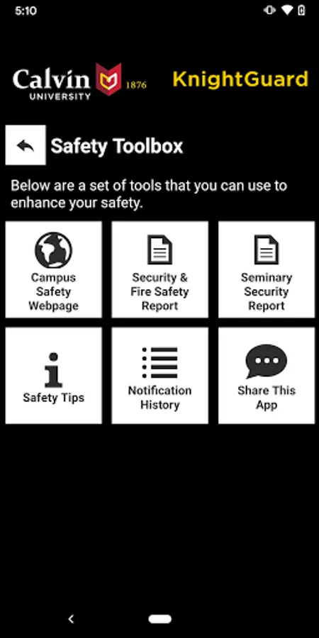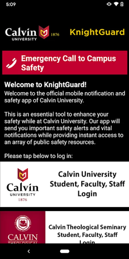 KnightGuard is the official safety app of Calvin University. It is the only app that integrates with Calvin University's safety and security systems. Calvin University has worked to develop a unique app that provides students, faculty and staff with added safety on the Calvin University campus. The app will send you important safety alerts and provide instant access to campus safety resources.