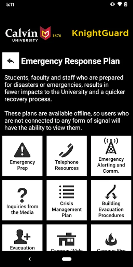 - Emergency Response Plan: Campus emergency documentation that can prepare you for disasters or emergencies. This can be accessed even when users aren’t connected to Wi-Fi or cellular data.