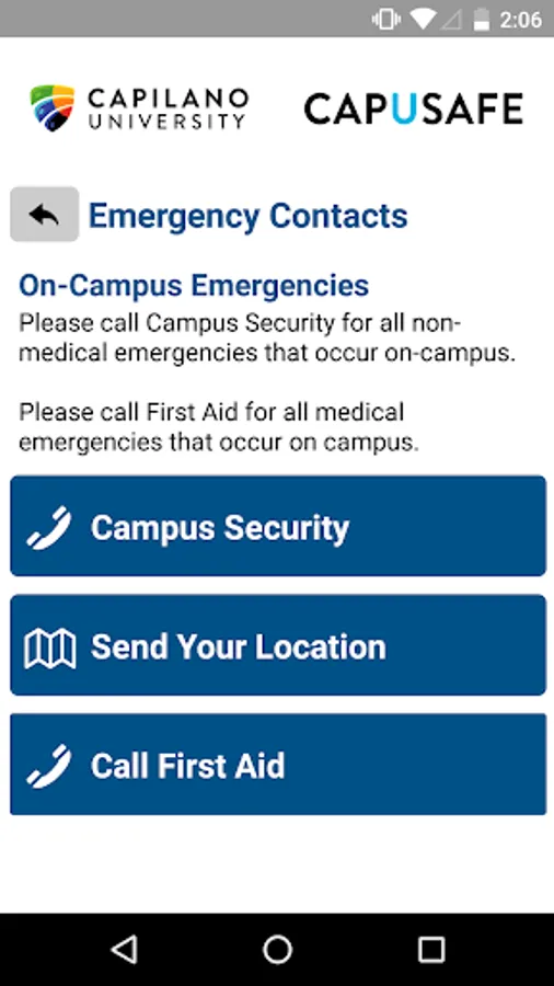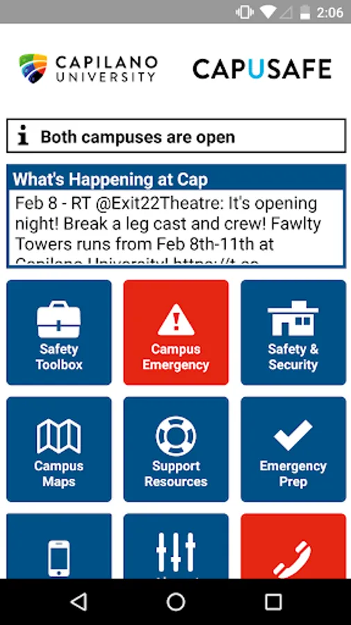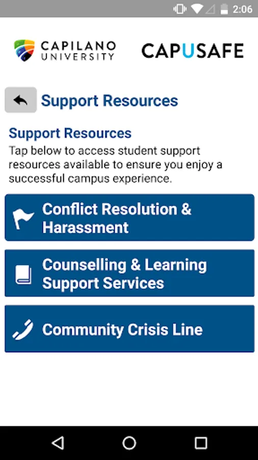 CapUSafe is a mobile safety app for students of Capilano University. The app provides quick access to campus security resources including the campus security emergency contacts, safety resources, emergency prep resources. Also, the app provides tips, information and tools to help students further enhance their security.
