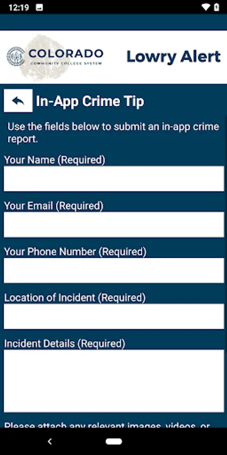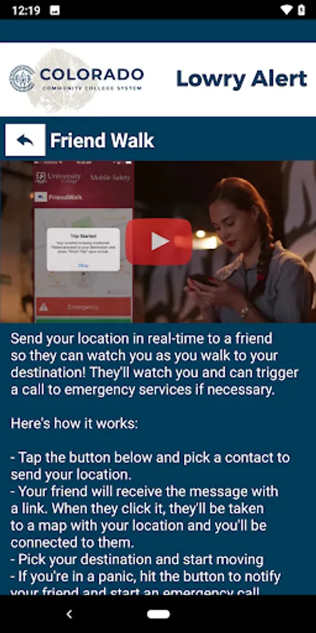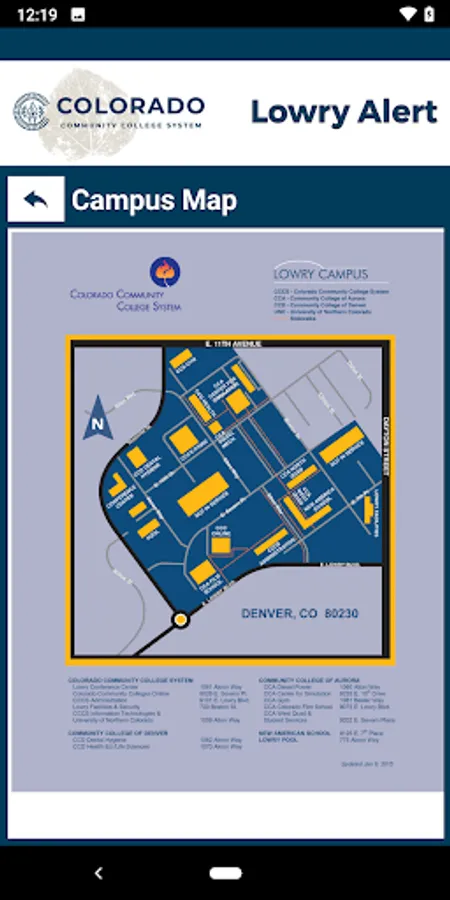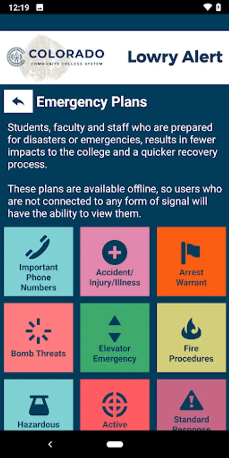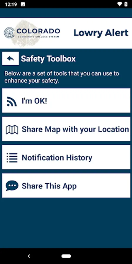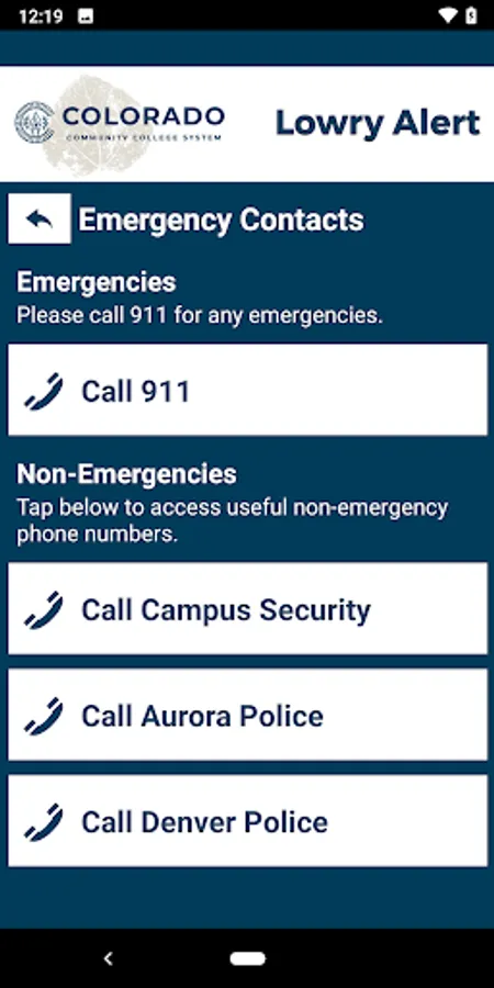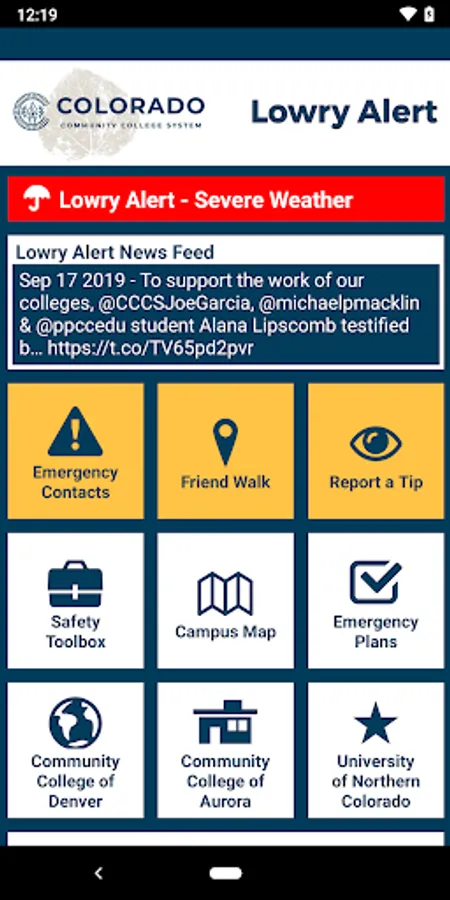 Lowry Alert is the official safety app of Colorado Community College System - Lowry Campus. It is the only app that integrates with CCCS Lowry's safety and security systems. Campus Security has worked to develop a unique app that provides students, faculty and staff with added safety on the CCCS Lowry campus. The app will send you important safety alerts and provide instant access to campus safety resources.