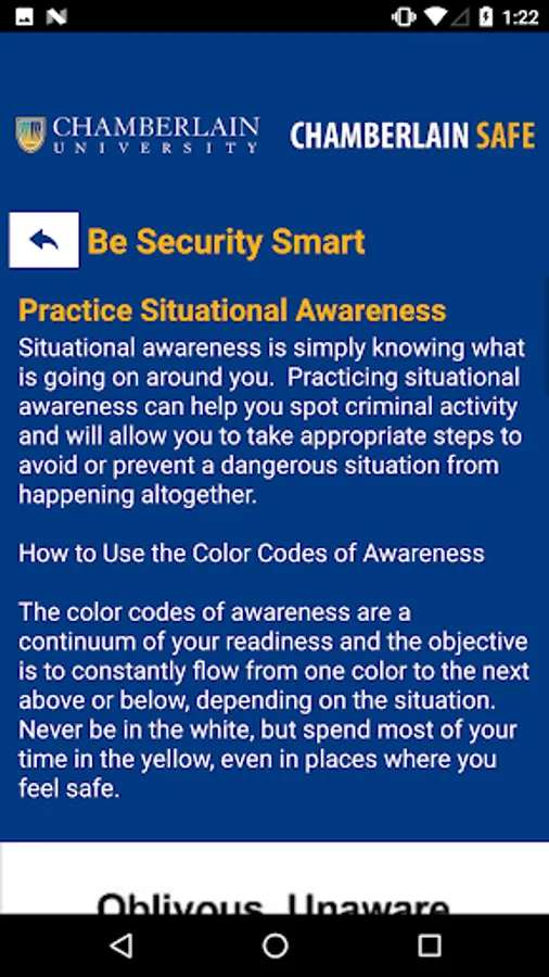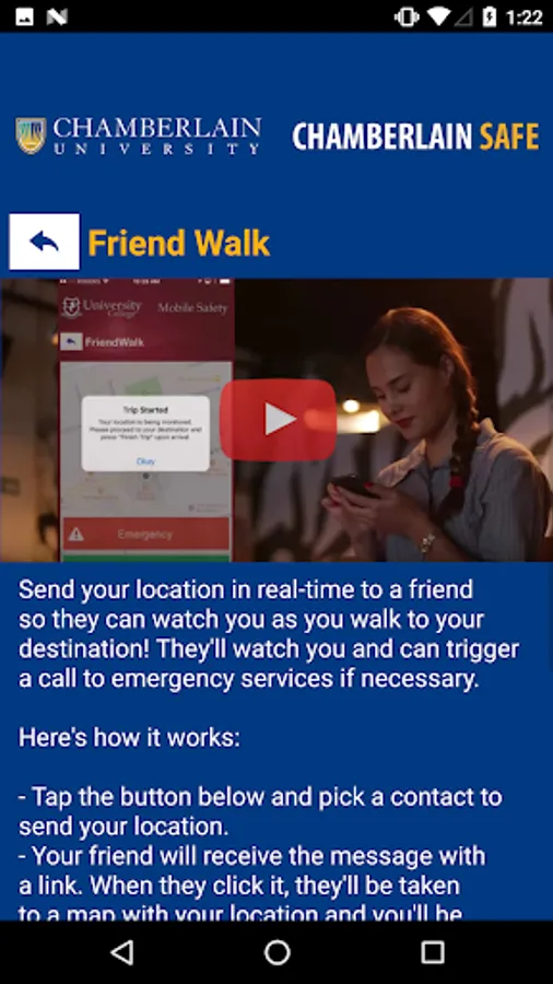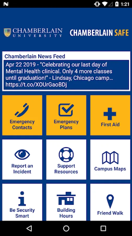 Chamberlain Safe is the official safety app of Chamberlain University. It is the only app that integrates with Chamberlain University's safety and security systems. The Safety and Security Department has worked to develop a unique app that provides students, faculty and staff with added safety on the Chamberlain University campus. The app will send you important safety alerts and provide instant access to campus safety resources.