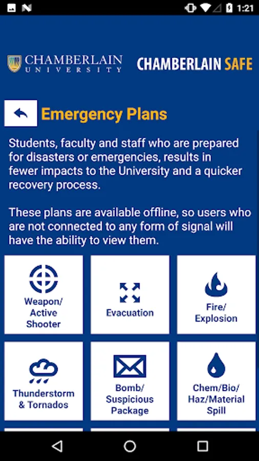 - Emergency Plans: Campus emergency documentation that can prepare you for disasters or emergencies. This can be accessed even when users aren’t connected to Wi-Fi or cellular data.