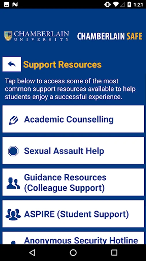- Support Resources: Access support resources in one convenient app to enjoy a successful experience at Chamberlain University.
