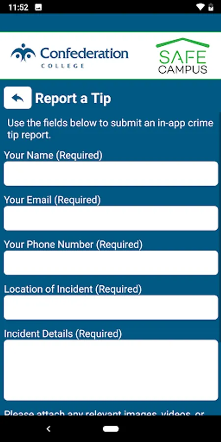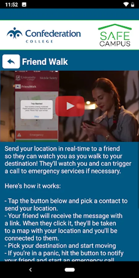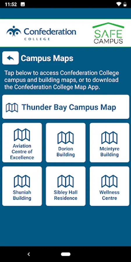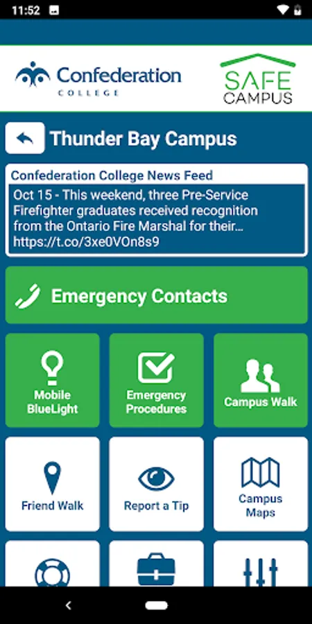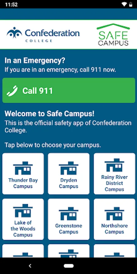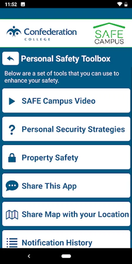 Safe Campus is the official safety app of Confederation College. It is the only app that integrates with Confederation College's safety and security systems. Public Safety and Risk Management has worked to develop a unique app that provides students, faculty and staff with added safety on the Confederation College campus. The app will send you important safety alerts and provide instant access to campus safety resources.