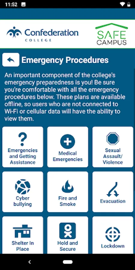 - Emergency Procedures: Campus emergency documentation that can prepare you for disasters or emergencies. This can be accessed even when users aren’t connected to Wi-Fi or cellular data.