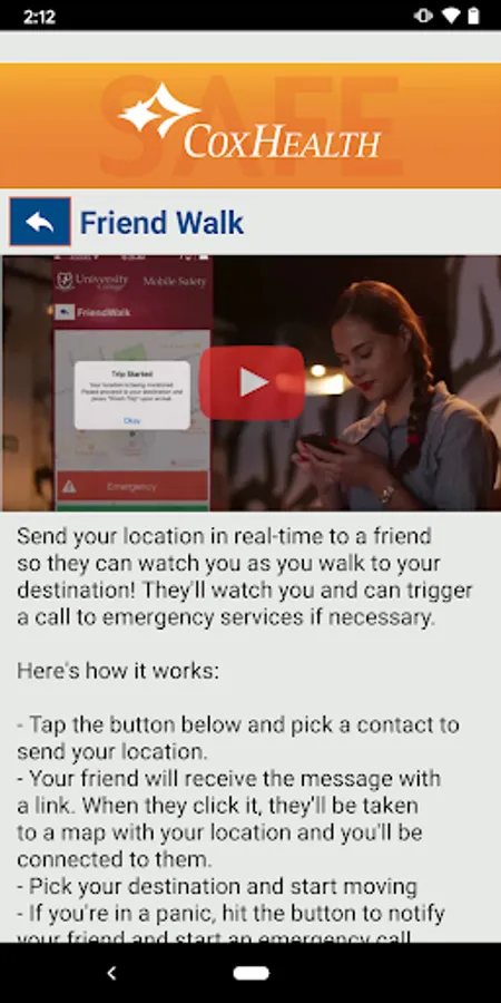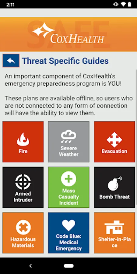 - Safety Notifications: Receive instant notifications and instructions from CoxHealth safety when on-campus emergencies occur.