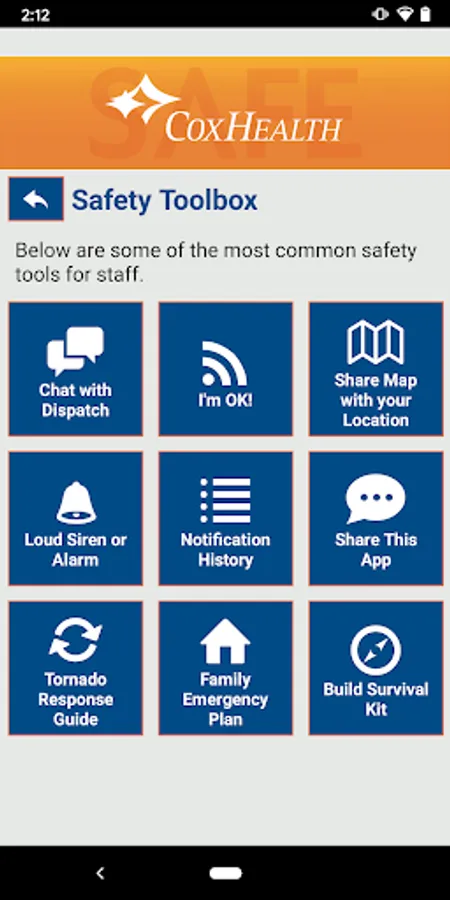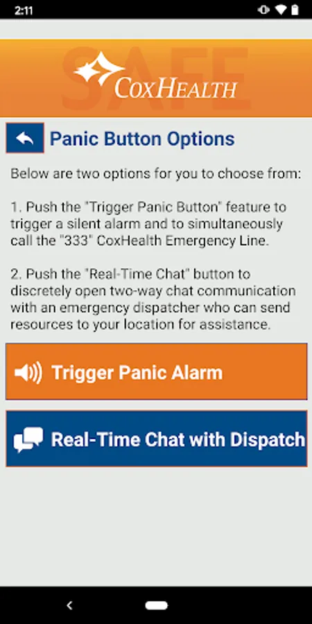 - Chat with Dispatch: Communicate live with security staff at CoxHealth via chat.