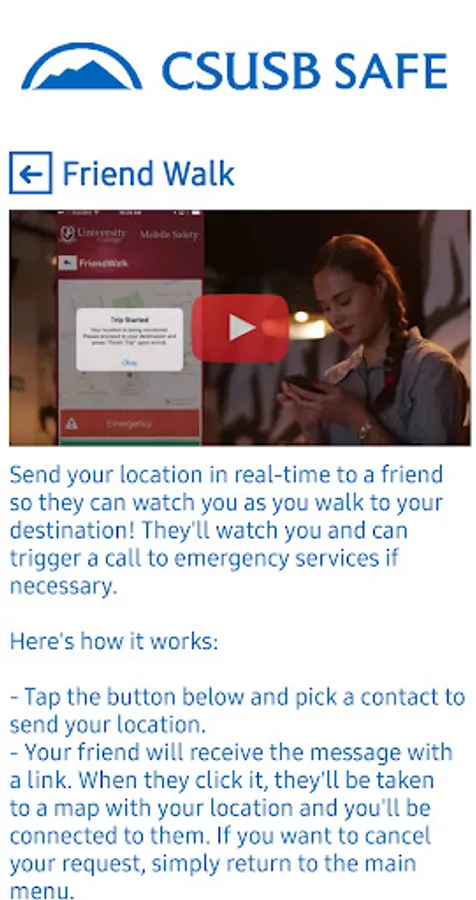 - Friend Walk: Send your location to a friend through email or SMS on your device. Once the friend accepts the Friend Walk request, the user picks their destination and their friend tracks their location in real time; they can keep an eye on them to make sure they make it safely to their destination.