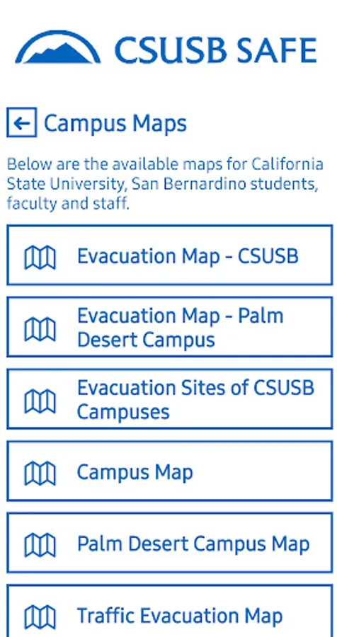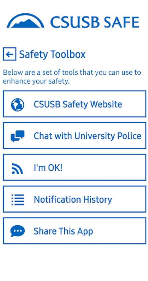 CSUSB Safe is the official safety app of CSUSB. It is the only app that integrates with CSUSB's safety and security systems. University Police has worked to develop a unique app that provides students, faculty and staff with added safety on the CSUSB campus. The app will send you important safety alerts and provide instant access to campus safety resources.