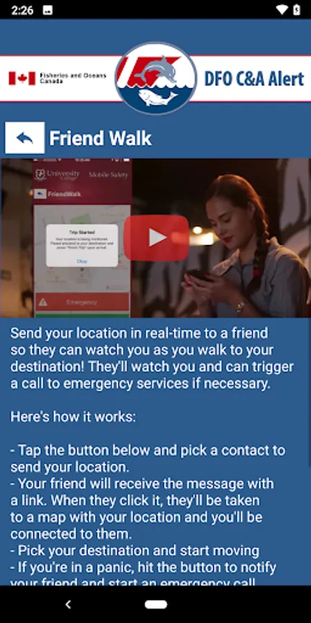 DFO C&A Alert is the official safety app of Department of Fisheries and Oceans - Central and Arctic. It is the only app that integrates with DFO C&A's safety and security systems. DFO C&A Security has worked to develop a unique app that provides students, faculty and staff with added safety on the DFO Central and Arctic campus. The app will send you important safety alerts and provide instant access to campus safety resources.
