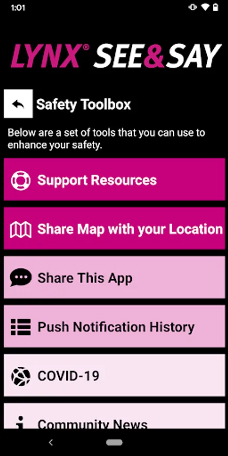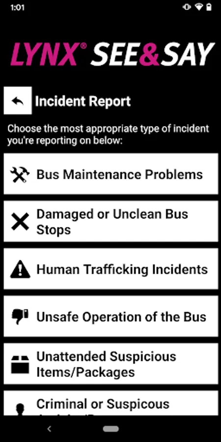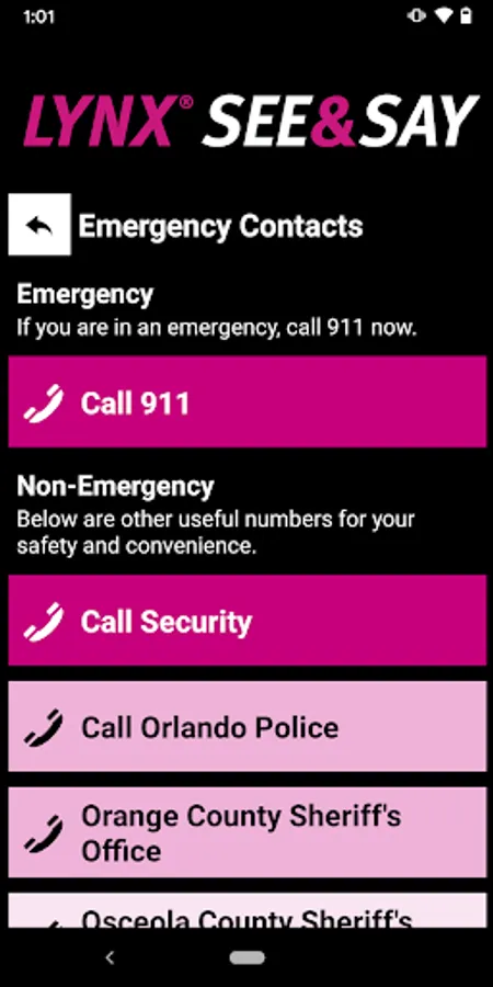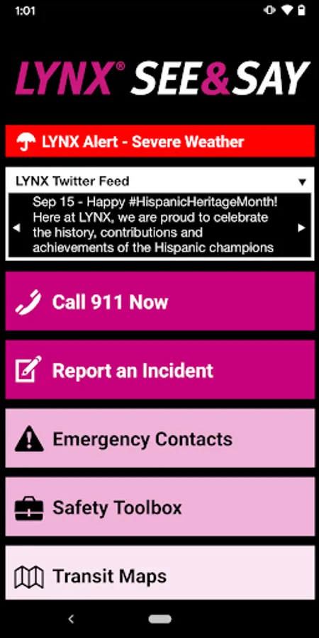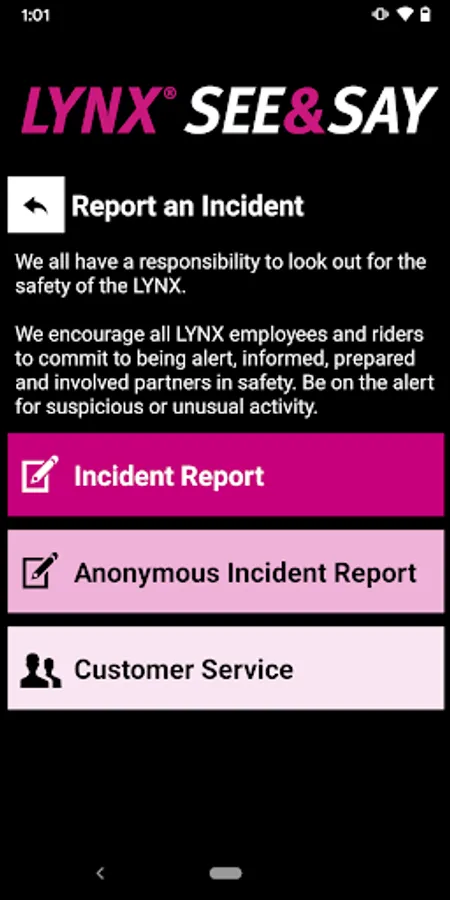 LYNX See & Say is the official safety and reporting app of LYNX. It is the only app that integrates with LYNX's safety and security systems. LYNX has worked to develop a unique app that provides all its users with added safety and security on the LYNX transit. The app will send you important safety alerts and provide instant access to safety and security resources.