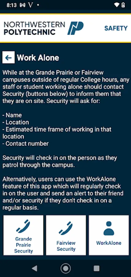 - WorkAlone: Use the app to "check in" with you periodically while working alone or during late hours. If you don't respond, the app will alert Campus Security.