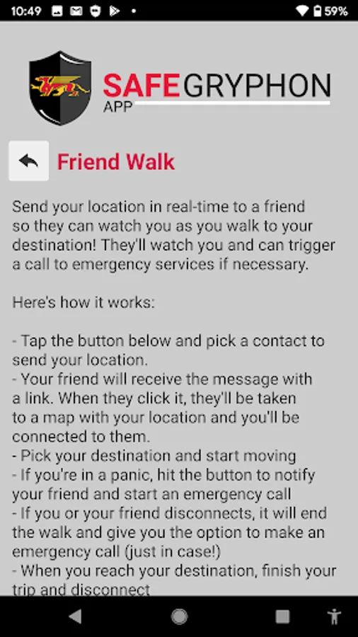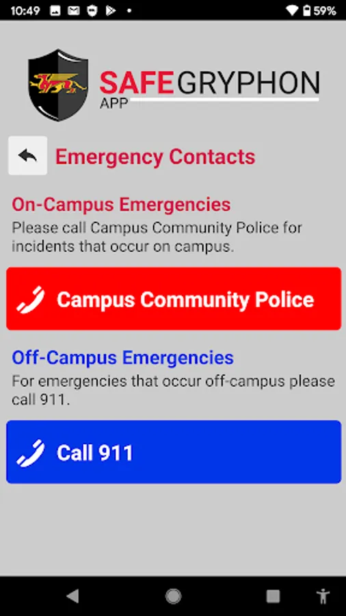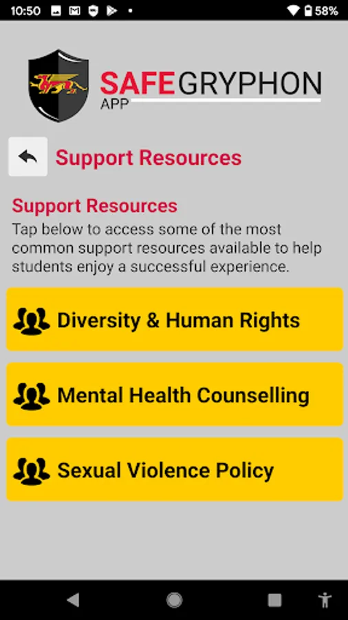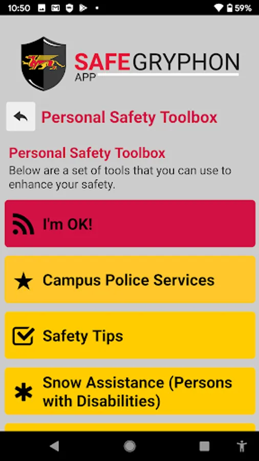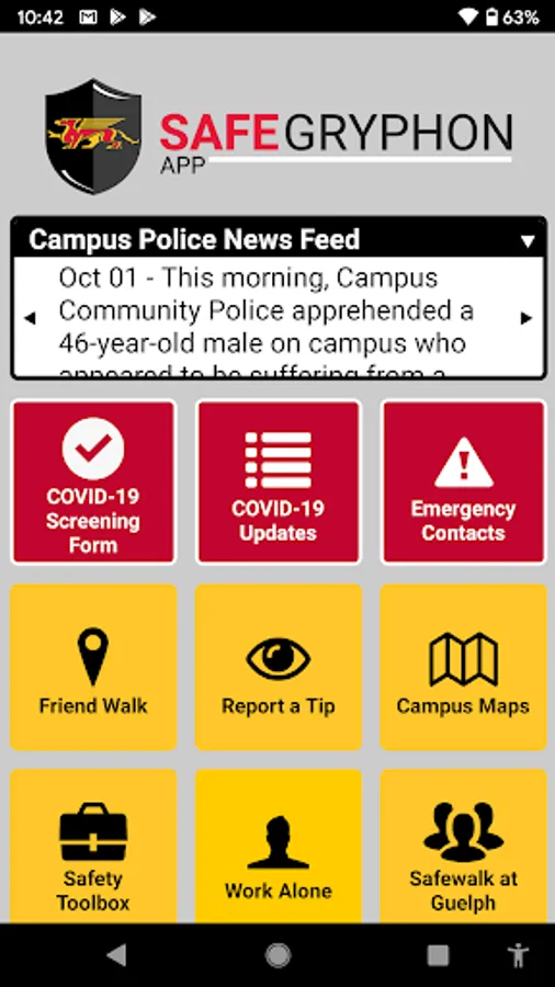 SafeGryphon is the official safety app of University of Guelph. It is the only app that integrates with U of Guelph's safety and security systems. University of Guelph Police Department has worked to develop a unique app that provides students, faculty and staff with added safety on the university campus. The app will send you important safety alerts and provide instant access to campus safety resources.