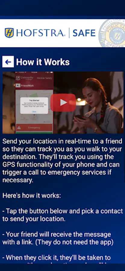 - Mobile Bluelight: Send your location to Hofstra University public safety in real-time in case of a crisis.