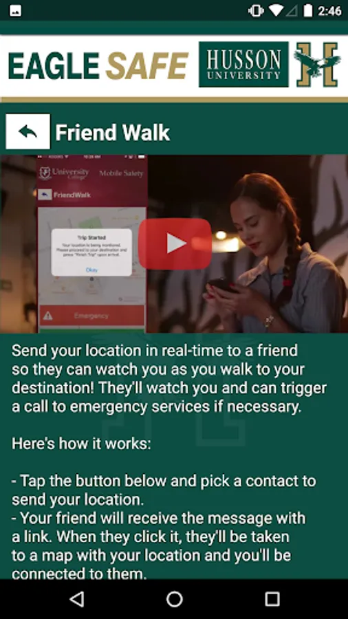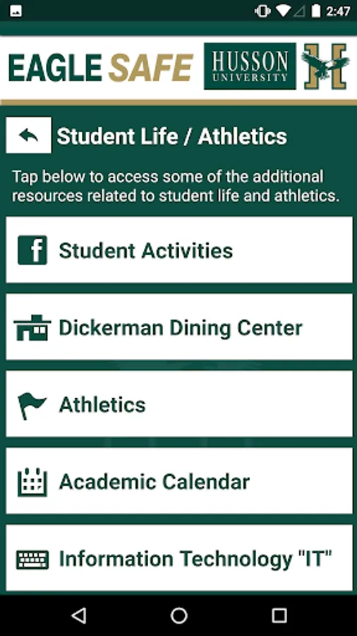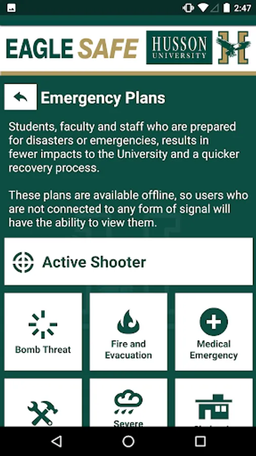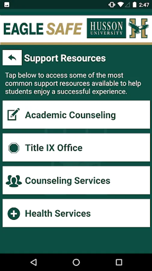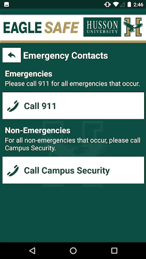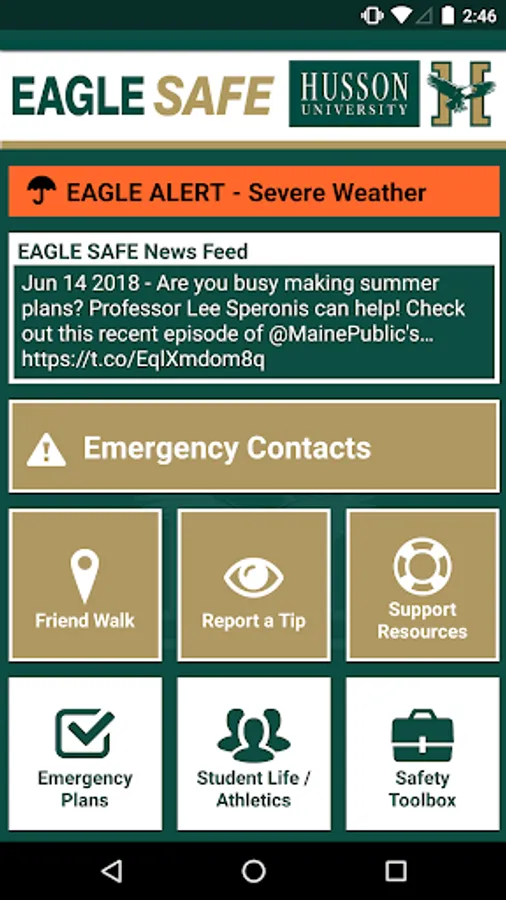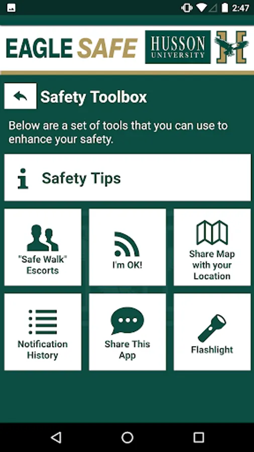 Eagle Safe is the official safety app of Husson University. It is the only app that integrates with Husson University's safety and security systems. Campus Security has worked to develop a unique app that provides students, faculty and staff with added safety on the Husson University campus. The app will send you important safety alerts and provide instant access to campus safety resources.