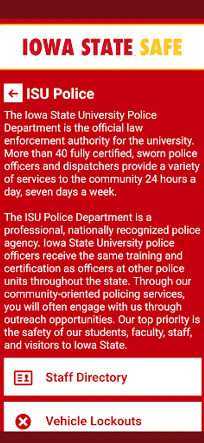 Iowa State Safe is the official safety app of Iowa State University. It is the only app that integrates with Iowa State University's safety and security systems. The ISU Police has worked to develop a unique app that provides students, faculty and staff with added safety on the Iowa State University campus. The app will send you important safety alerts and provide instant access to campus safety resources.