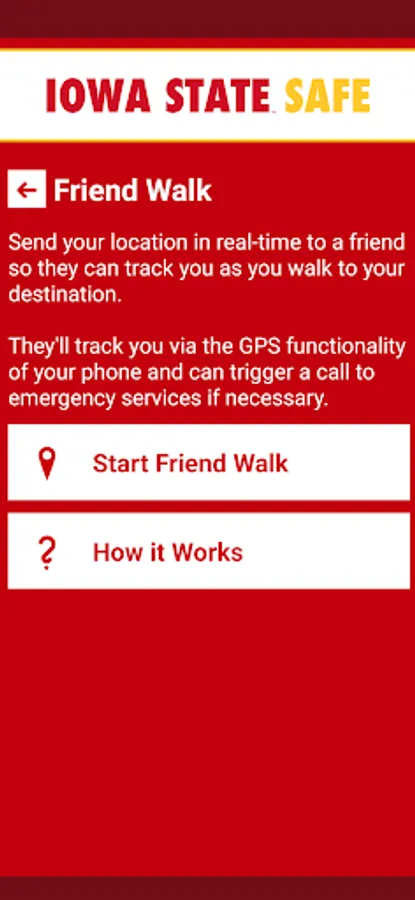 - Friend Walk: Send your location to a friend through email or SMS on your device. Once the friend accepts the Friend Walk request, the user picks their destination and their friend tracks their location in real time; they can keep an eye on them to make sure they make it safely to their destination.