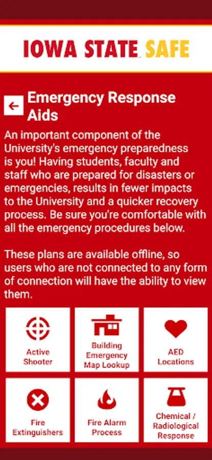 - Emergency Response Aids: Campus emergency documentation that can prepare you for disasters or emergencies. This can be accessed even when users aren’t connected to Wi-Fi or cellular data.